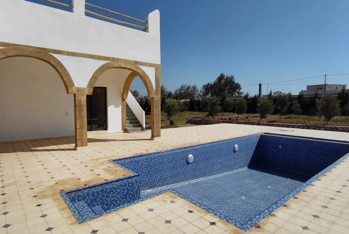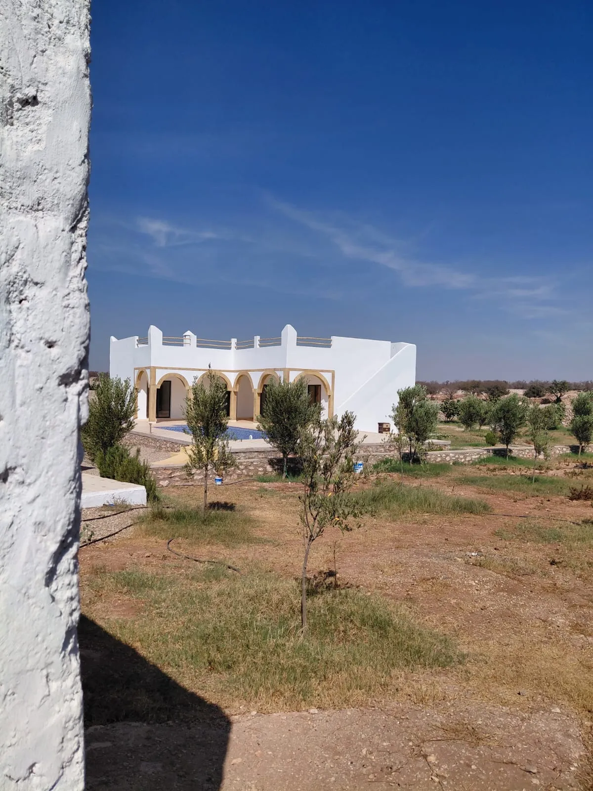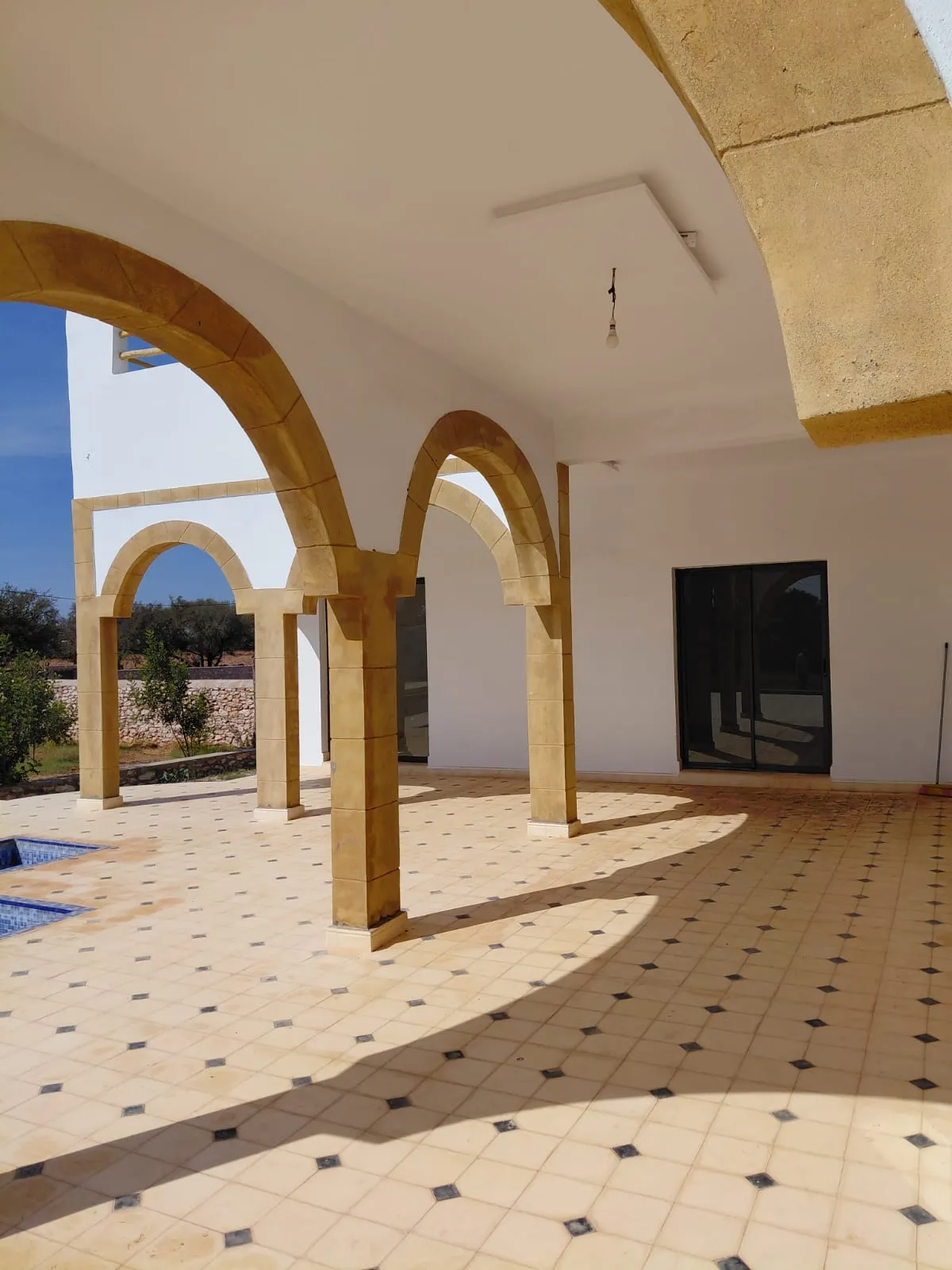 À l’extérieur, la propriété bénéficie d’une piscine carrelée de 9 x 4 m entourée de verdure, d’une grande terrasse couverte face au jardin et d’un toit-terrasse avec vue dégagée sur la campagne environnante. Le puits privé avec château d’eau assure l’autonomie en eau. L’ensemble convient aussi bien pour une résidence secondaire que pour un projet de location saisonnière proche d’Essaouira.
