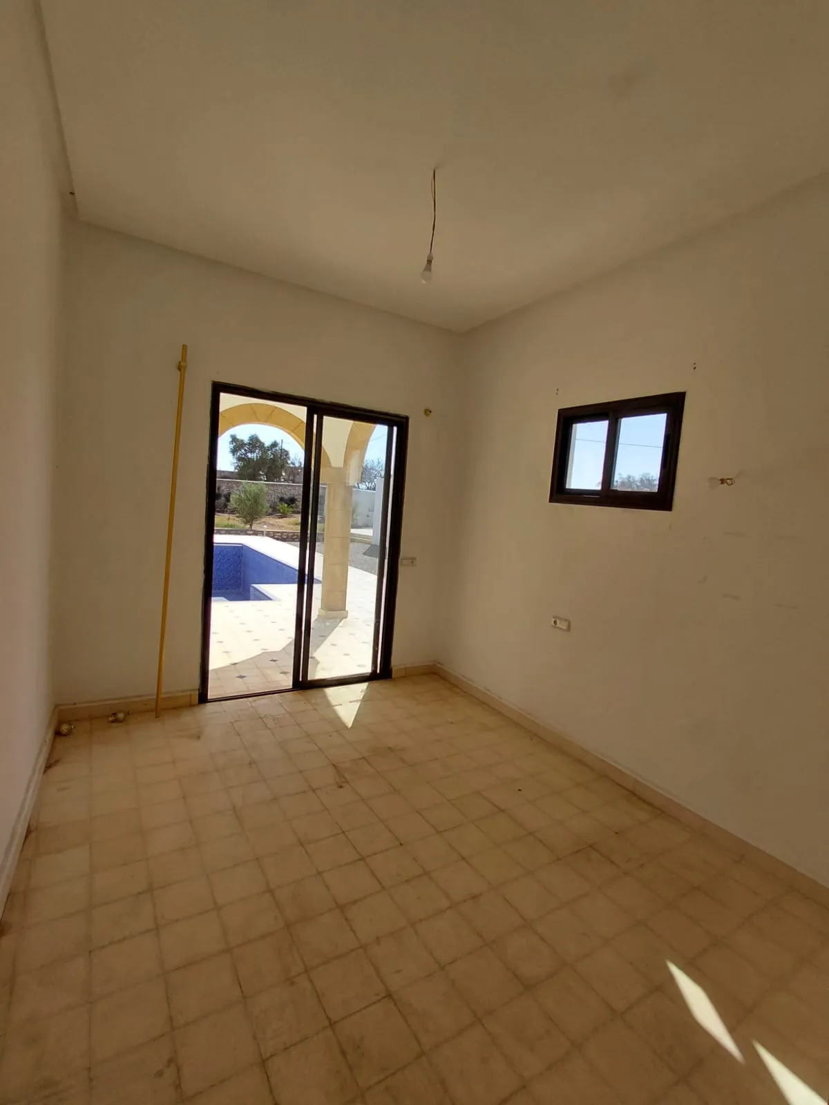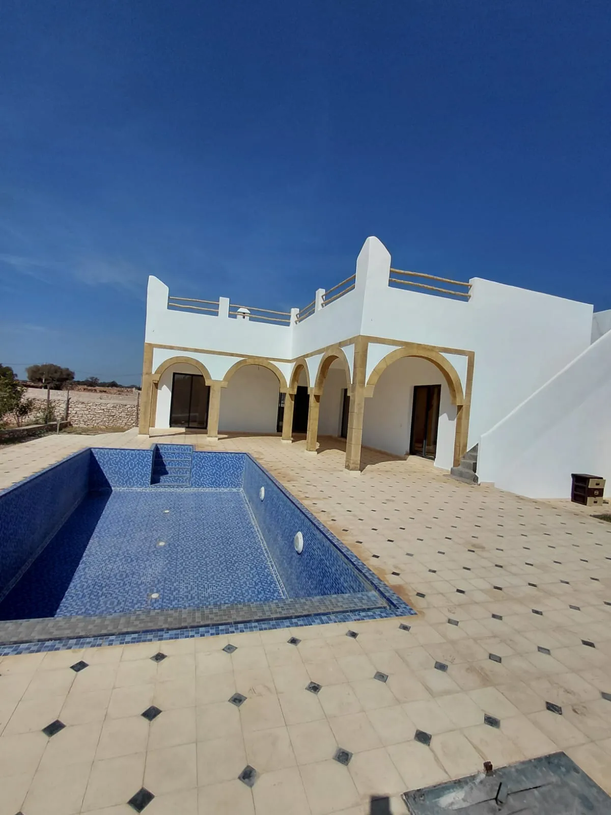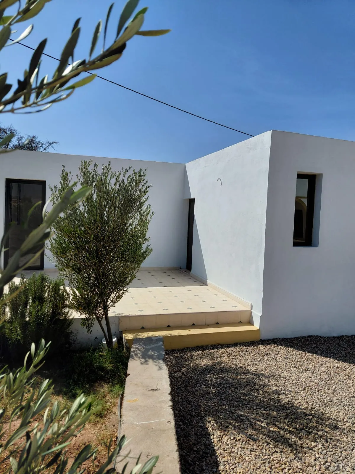 À l’extérieur, la propriété bénéficie d’une piscine carrelée de 9 x 4 m entourée de verdure, d’une grande terrasse couverte face au jardin et d’un toit-terrasse avec vue dégagée sur la campagne environnante. Le puits privé avec château d’eau assure l’autonomie en eau. L’ensemble convient aussi bien pour une résidence secondaire que pour un projet de location saisonnière proche d’Essaouira.