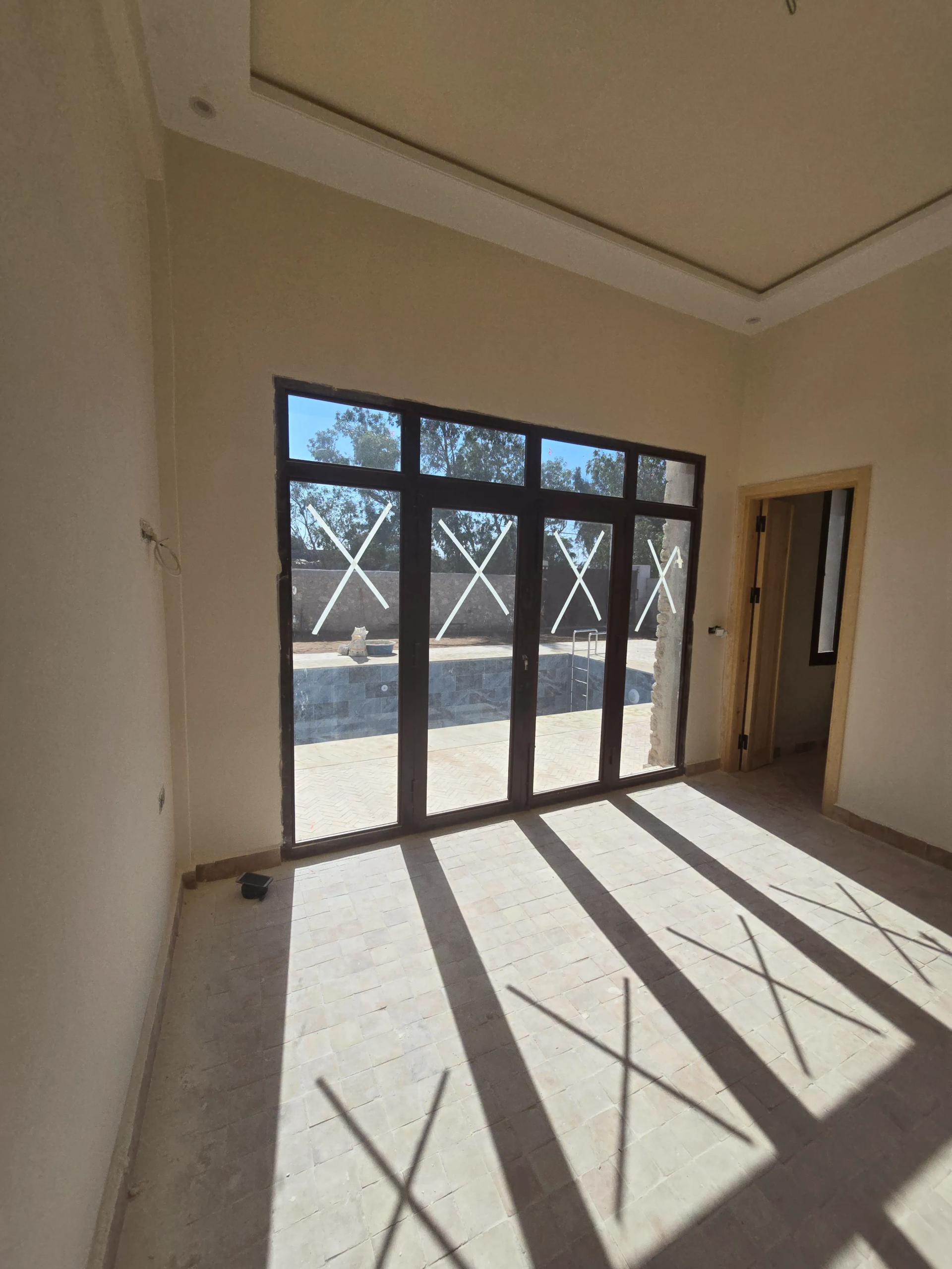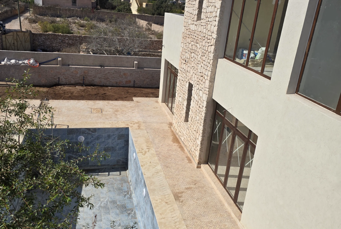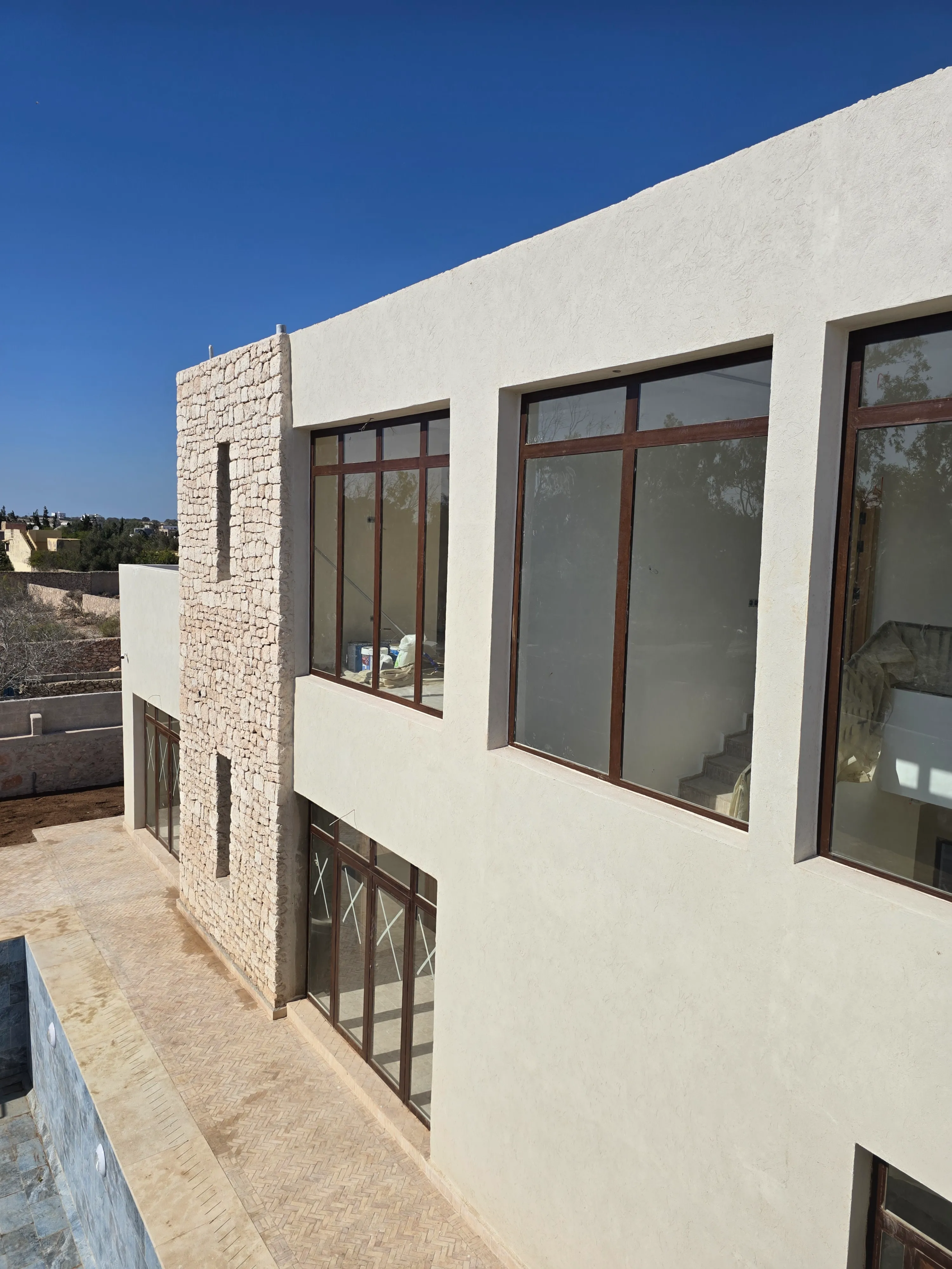 Édifiée sur un terrain de 590 m², la maison offre environ 150 m² habitables. On y trouve un salon convivial aux finitions soignées, une cuisine ouverte, ainsi que 4 chambres spacieuses, chacune avec salle de bain en tadelakt naturel et dressings intégrés pour un rangement optimisé.